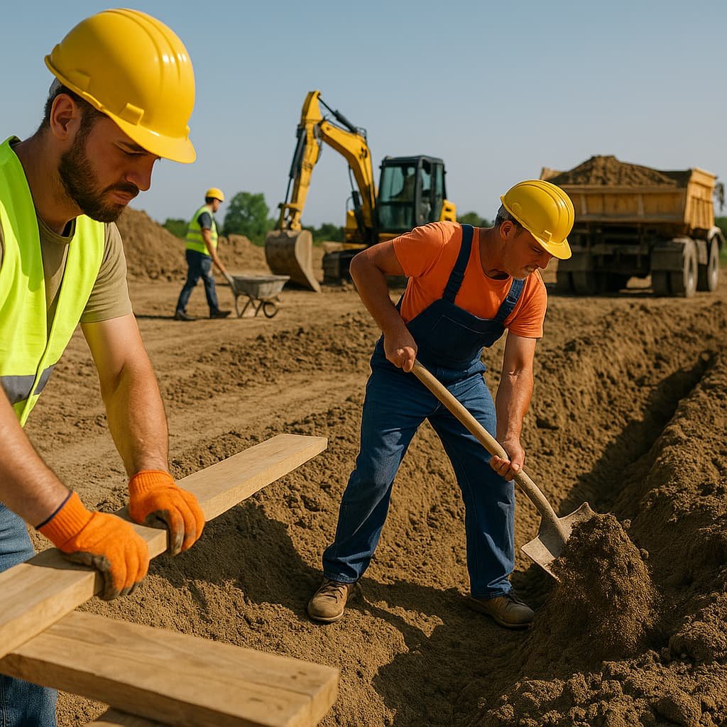 تنظيف وتسوية الأرض. تنفيذ أعمال الحفر والردم حسب المخططات الهندسية. دراسة التربة وأعمال الإحلال إذا لزم الأمر.